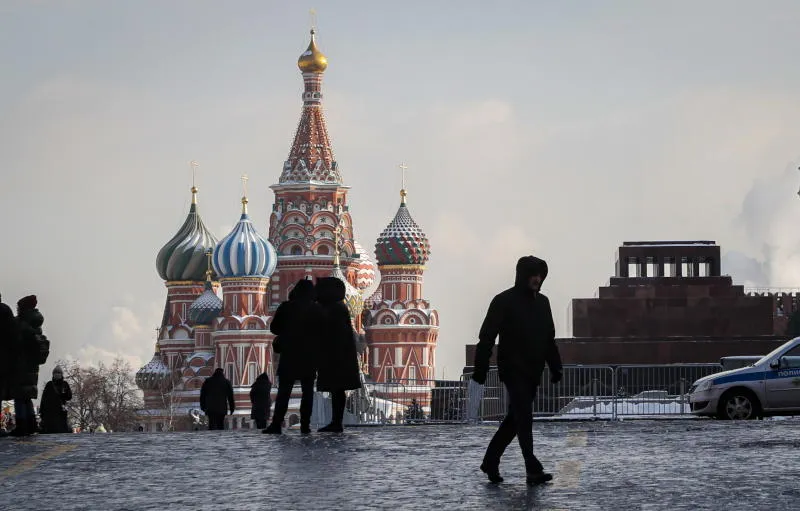 أشخاص يعبرون الميدان الأحمر في موسكو (إ.ب.أ)