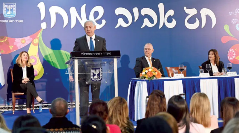 نتنياهو يتحدث الثلاثاء خلال الكلمة التقليدية بعيد الفصح مع موظفي مكتب رئيس الوزراء (د.ب.أ)