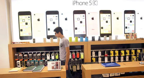 أحد الباعة يتجول في محل مختص ببيع هواتف الجوال (أبل) في طهران أول من أمس (أ.ب)