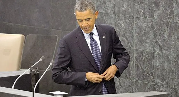 الرئيس الأميركي باراك أوباما إثر إلقاء كلمته في مقر الأمم المتحدة أمس (أ.ف.ب)