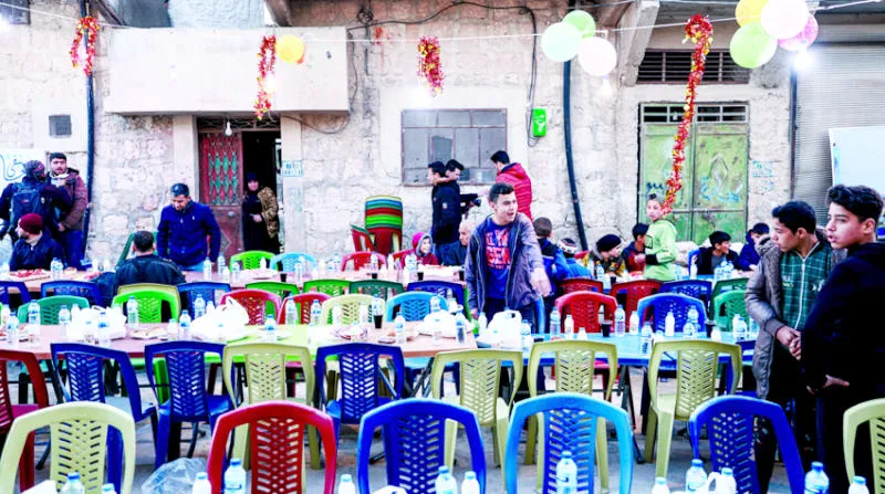 إفطار جماعي لمنظمة «معنا» في أحد الأحياء التي دمرها الزلزال في مدينة الأتارب شمال حلب (د.ب.أ)
