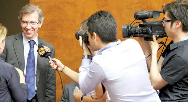 ممثل الأمين العام للأمم المتحدة يتحدث للصحافيين في جنيف بشأن مفاوضات الاطراف الليبية أمس (رويترز)