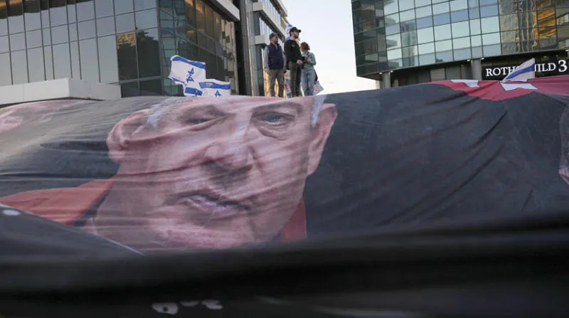 لافتة ضخمة في تل أبيب لرئيس الوزراء الإسرائيلي نتنياهو احتجاجا على خطط الحكومة اليمينية لاستهداف النظام القضائي (أ.ب)