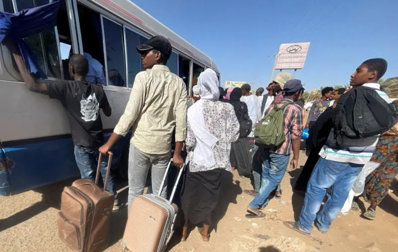 أشخاص يتجمعون في إحدى المحطات للفرار من الخرطوم وسط المعارك (رويترز)