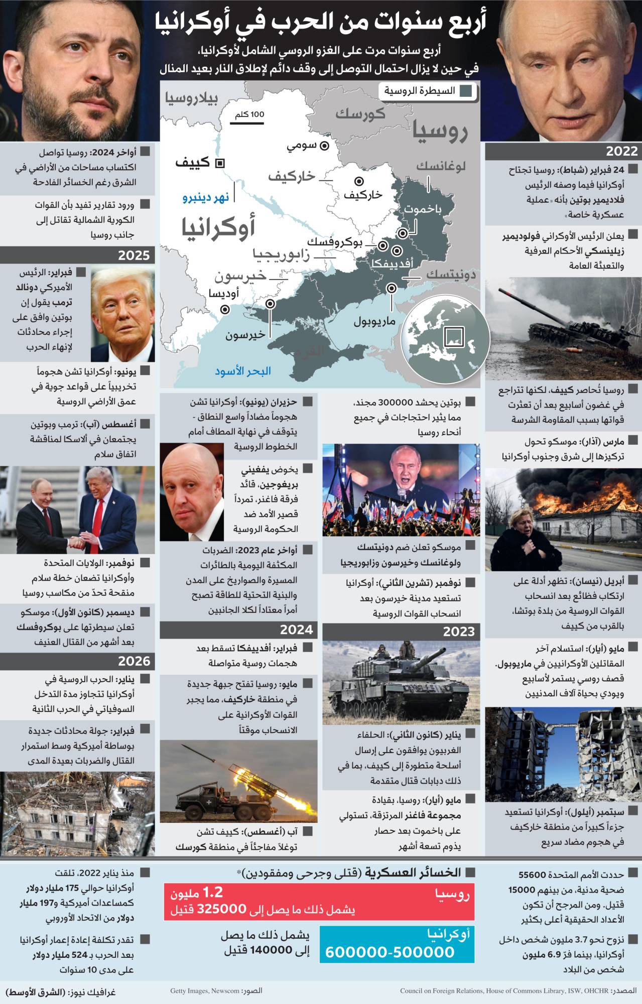 مع حلول الذكرى الرابعة لاندلاع الحرب الشاملة بين روسيا وأوكرانيا، تبدو الحصيلة كارثية بكل المعايير، ليس فقط على الطرفين المباشرين في هذه المواجهة، بل وعلى المحيط الإقليمي حولهما، والعالم كله الذي تعرَّض لأسوأ تداعيات لصراع عسكري مفتوح منذ الحرب العالمية الثانية.