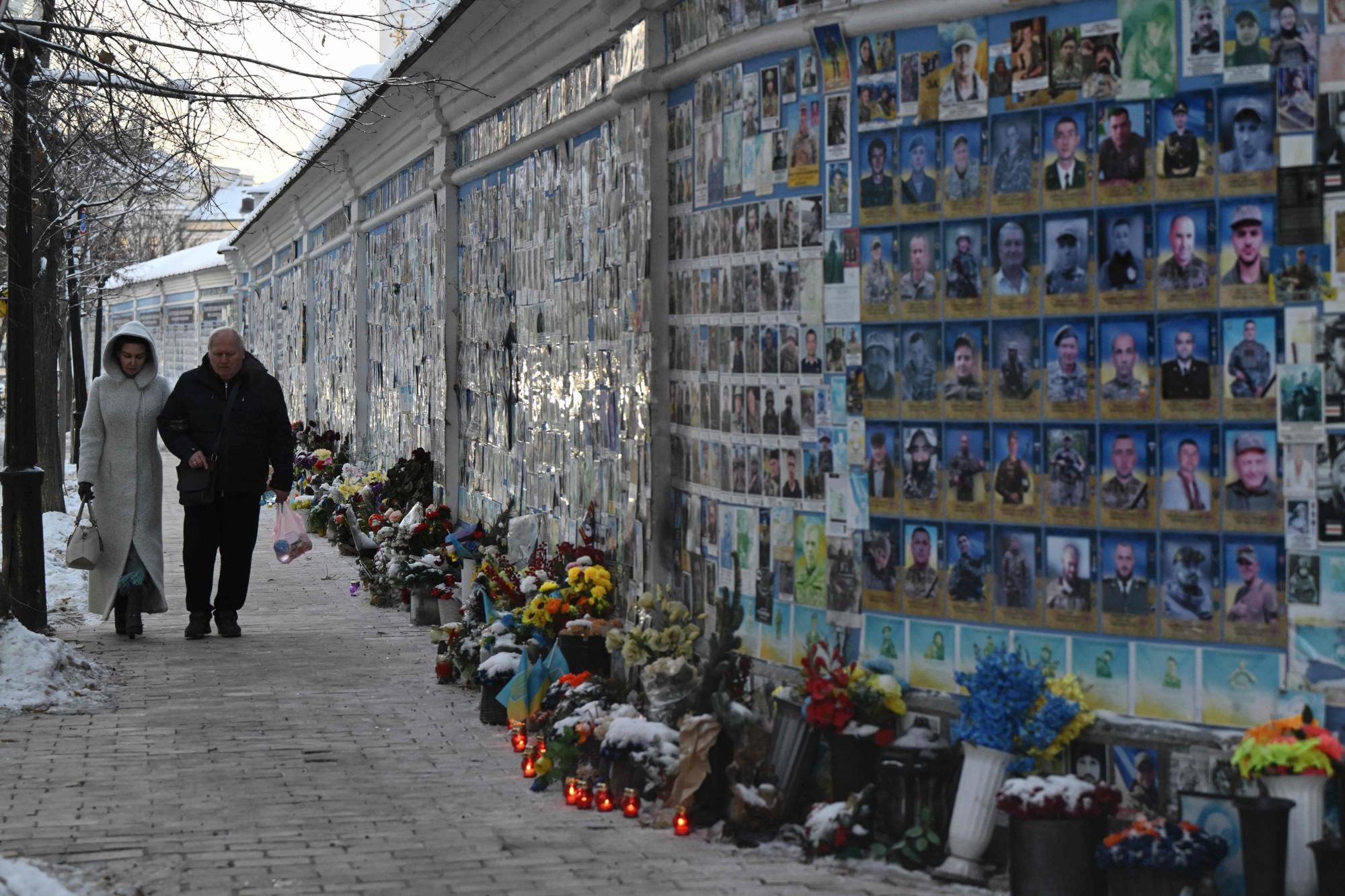 شخصان يمُرّان أمام نصب تذكاري لجنود قُتلوا بالحرب مع روسيا، بكييف يوم 2 فبراير (أ.ف.ب)