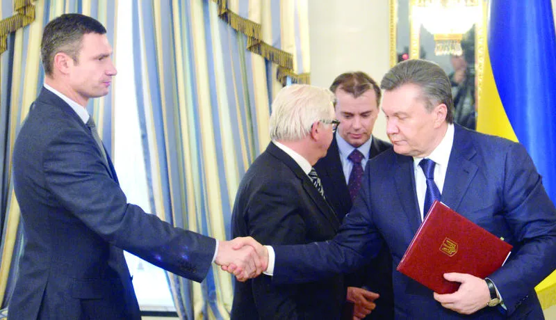 الرئيس يانوكوفيتش (يمين) يصافح الزعيم المعارض فيتالي كلتشكو بعد توقيع اتفاق السلام في كييف أمس (أ.ف.ب)
