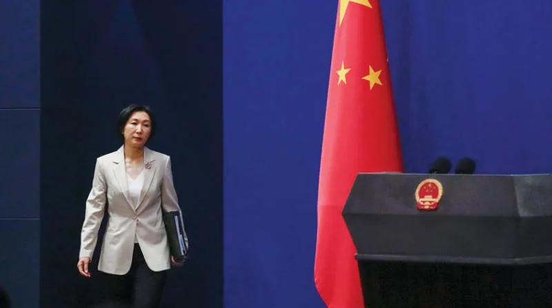 الناطقة باسم الخارجية الصينية ماو نينغ لدى وصولها إلى المؤتمر الصحافي أمس (أ.ب)