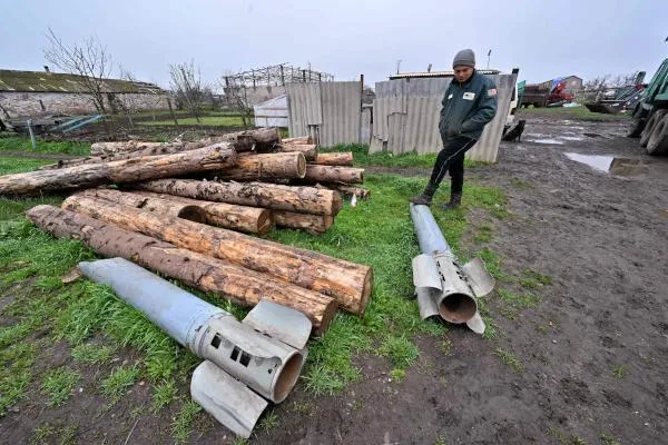 أرشيفية لمزارع أوكراني يقف بجوار بقايا صواريخ سقطت في مزرعته بمنطقة ميكولايف (ا.ف.ب)