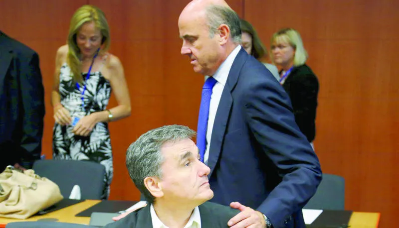 وزير الاقتصاد الإسباني يحيي وزير المالية اليوناني خلال اجتماع وزراء مالية منطقة اليورو في بروكسل أمس (رويترز)