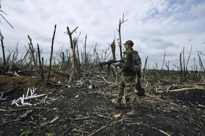 جندي أوكراني يسير في أفدييفكا حيث وقعت معارك عنيفة مع الروس في منطقة دونيتسك بأوكرانيا (أ.ب)