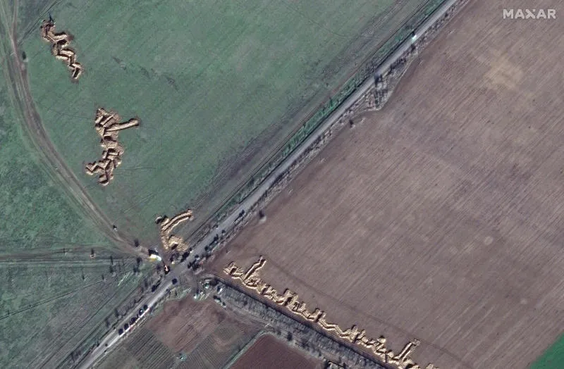 صورة للأقمار الصناعية تُظهر تحصينات روسية بالقرب من قرية ميدفيديفكا (رويترز)