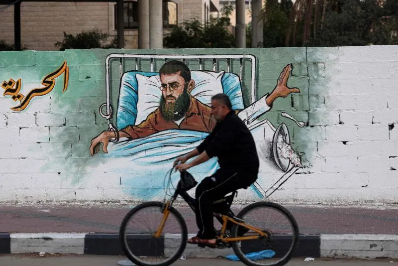 رجل فلسطيني يركب دراجته أمام لوحة جدارية تصور خضر عدنان (أ.ف.ب)