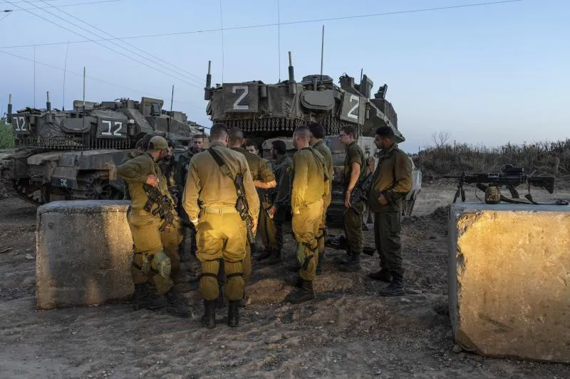 جنود إسرائيليون بجانب دباباتهم بالقرب من الحدود مع غزة الثلاثاء (أ.ب)