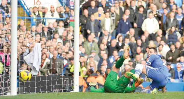 هاوراد حارس ايفرتون اخطأ التقدير لانشغاله بجون تييري لتصطدم كرة لامبارد بقدمه وتسكن شباكه هدفا لتشيلسي (رويترز)