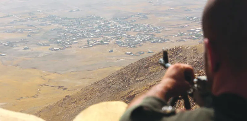 عنصر في البيشمركة يطل من موضعه فوق جبل زردك على قرية خاضعة لسيطرة {داعش} شرق الموصل (أ.ف.ب)