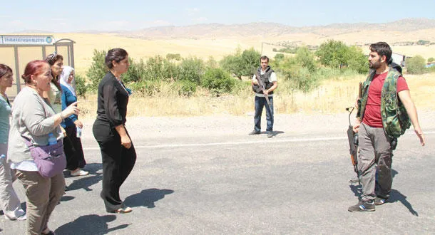 دليك أوجلان ابنة أخ عبد الله أوجلان عضو البرلمان التركي عن حزب الشعوب مع عدد من أعضاء حزبها وقد اعترضهم رجال أمن أتراك في ديار بكر أمس (إ.ب.أ)