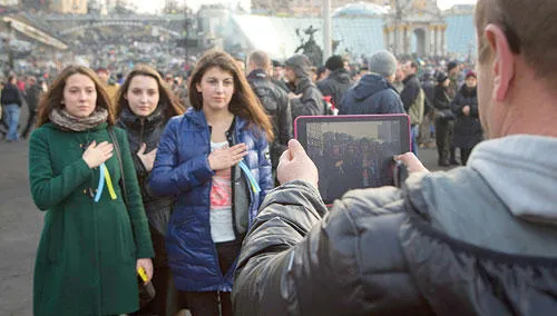 فتيات أوكرانيات يقفن لالتقاط صورة في ساحة الاستقلال بكييف أمس (أ.ب)