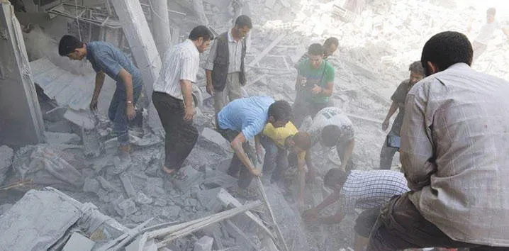 عملية البحث عن جثث الضحايا المدنيين بعد جولة من القصف النظامي على دوما حيث سقط أكثر من 50 قتيلاً (أ.ب)