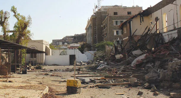 موقع التفجير الذي تعرض له مبنى الأمن السياسي ومعسكر القوات الخاصة في عدن أمس (إ.ب.أ)