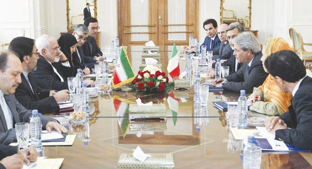 اجتماع بين مسؤولين إيطاليين وإيرانيين بحضور وزير الخارجية الإيراني محمد جواد ظريف ونظيره الإيطالي باولو جينتيلوني في طهران في 4 من الشهر الحالي (رويترز)