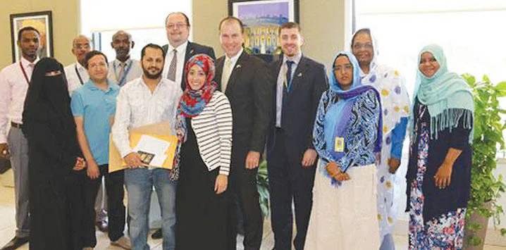 عدد من العاملين في السفارة الأميركية بالخرطوم مع بعض المهاجرين السودانيين ({الشرق الأوسط})