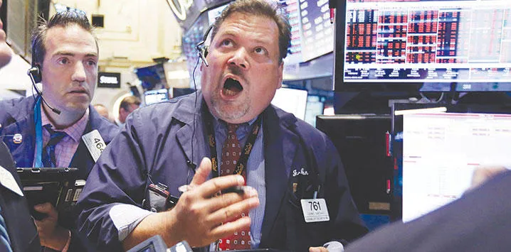علامات الصدمة على وجهي موظفين في بورصة نيويورك أمس بعد هبوط الأسهم الصينية (أ.ب)
