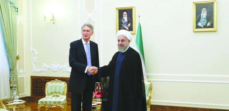 الرئيس الإيراني حسن روحاني لدى استقباله وزير الخارجية البريطاني فيليب هاموند في طهران أمس (أ.ب)