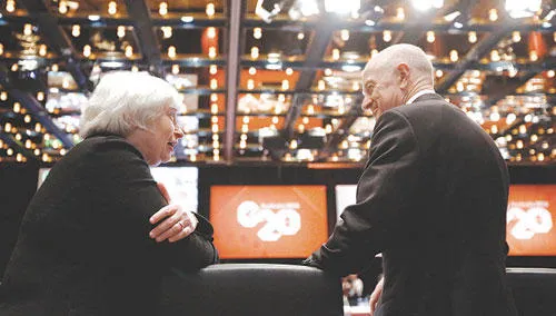 جانيت يلين رئيسة الاحتياطي الفيدرالي (المركزي الأميركي) الجديدة التي تشارك لأول في اجتماعات مجموعة العشرين إلى جانب غلان ستيفنس رئيس المركزي الأسترالي (أ.ب)