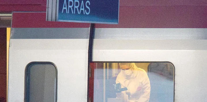 رجال البحث الجنائي يجمعون الأدلة من القطار السريع الرابط بين أمستردام وباريس يوم الجمعة الماضي قبل توجيه الاتهام الى الشاب المغربي أيوب الخزاني (ا.ب)