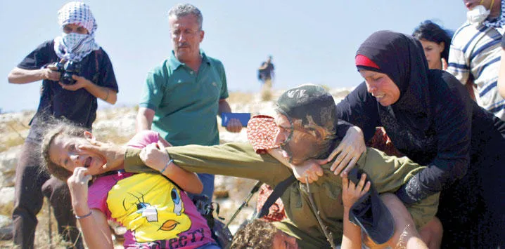 جندي إسرائيلي يحاول اعتقال شابة فلسطينية خلال المواجهات التي اندلعت أمس بين الجانبين بالقرب من رام الله (رويترز)