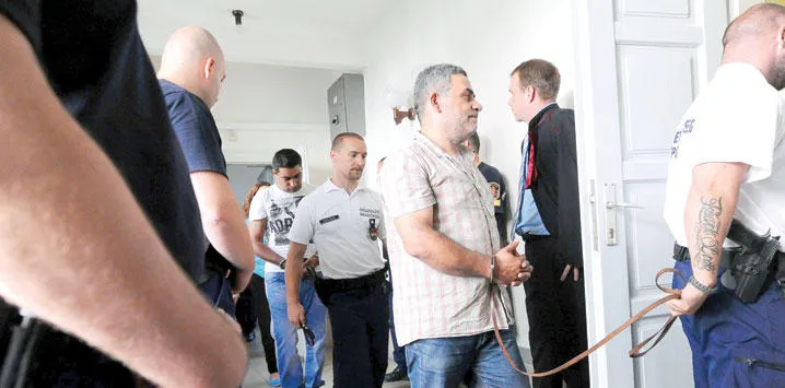 أحد المشتبه بهم الأربعة في قضية «شاحنة الدواجن» يقتاده أمس شرطي مجري إلى محكمة مدينة كيسكيميت الواقعة بين بودابست والحدود الصربية (أ.ف.ب)