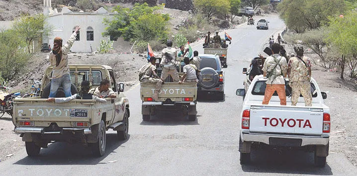 مقاتلون مولون للرئيس اليمني عبد ربه منصور هادي على متن سيارات عسكرية في أحد شوارع مدينة الضالع 30 كلم جنوب العاصمة صنعاء (أ ف ب)