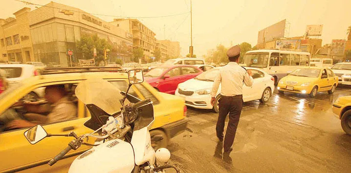 شرطي مرور ينظم حركة السير في أحد شوارع بغداد خلال عاصفة ترابية أمس (أ.ف.ب)