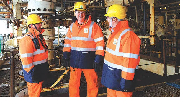 رئيس الوزراء البريطاني ديفيد كاميرون يتحدث لمهندسين على متن منصة نفطية تابعة لشركة «بي بي» على بعد 160 كيلومترا قبالة سواحل أبرديين الأسكوتلندية أمس (رويترز)