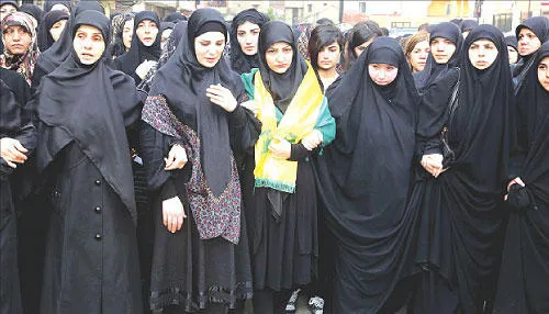 لبنانيات ينتحبن خلال تشييع مقاتل في حزب الله، في ضاحية بيروت الجنوبية، أمس، كان لقي حتفه في سوريا (أ.ف.ب)