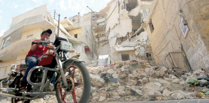 شاب يقود دراجته النارية في شوارع حلب القديمة المدمرة أمس (رويترز)