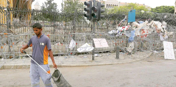 عامل ينظف الشارع قرب مقر الحكومة اللبنانية المحاط بالأسلاك الشائكة في العاصمة بيروت أمس (رويترز)