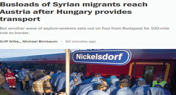 ونقلت الصحف الأميركية، وأيضًا القنوات التلفزيونية، في تغطية مكثفة ليس لها مثيل، مناظر السلطات في المجر وهي تغلق محطة السكة الحديد في بودابست لمنع مئات المهاجرين من الصعود إلى قطارات تتجه نحو عواصم أوروبية أخرى. ووصول الآلاف من المهاجرين إلى ألمانيا من بودابست، بينما وفرت لهم الشرطة ورجال الإطفاء والمتطوعون الطعام والماء والمساعدات الطبية. وخبر أن أكثر من 11000 من سكان آيسلندا فتحوا منازلهم لاستقبال المهاجرين السوريين للمساعدة في مواجهة هذه الأزمة الأوروبية التي لم تحدث من قبل. وتأخير قطارات «يوروستار» بين باريس ولندن من قبل مئات المهاجرين الذين حاولوا ركوب القطارات في كاليه متوجهين إلى لندن.