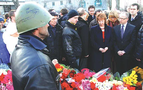 مسؤولة العلاقات الخارجية لدى الاتحاد الأوروبي كاثرين أشتون لدى زيارتها إلى كييف أمس التي بدأتها بموقع تذكاري لضحايا العنف حيث وضعت إكليلا من الزهور (رويترز)