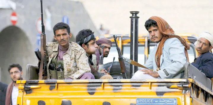 مقاتلون موالون للحوثي على متن سيارة شرطة في صنعاء (رويترز)