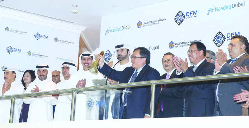 وقرع بامبانج برودجونيجورو وزير المالية الإندونيسي جرس افتتاح بورصة ناسداك دبي، أمس، احتفالا بإدراج الصكوك الأربعة بحضور محمد القرقاوي رئيس مجلس إدارة مركز دبي لتطوير الاقتصاد الإسلامي، وعيسى كاظم محافظ مركز دبي المالي العالمي الأمين العام لمركز دبي لتطوير الاقتصاد الإسلامي، ورئيس مجلس إدارة سوق دبي المالي، وعبد الواحد الفهيم رئيس مجلس إدارة ناسداك دبي، وحامد علي الرئيس التنفيذي لبورصة «ناسداك دبي».