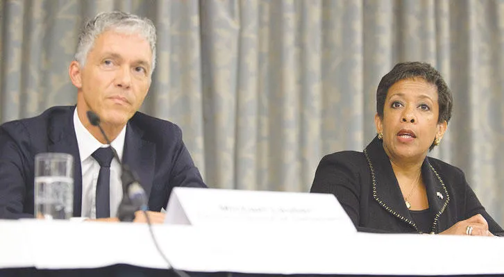 لينش المدعي العام الأميركي مع نظيرها السويسري لوبر (أ.ب)