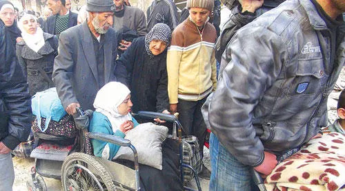 صورة وزعت أمس لفلسطينيين في مخيم اليرموك ينتظرون الحصول على مساعدات بعد أن أهلكتهم أشهر طوال من الجوع جراء الحصار (رويترز)