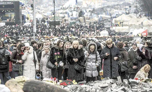 أوكرانيون يزورون ميدان الاستقلال بكييف أمس إحياء لذكرى ضحايا الاحتجاجات التي شهدتها البلاد اخيرا (أ.ف.ب)