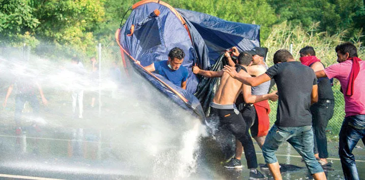 رجال شرطة من المجر يستخدمون خراطيم المياه القوية لتفريق مظاهرة لمهاجرين على الحدود قرب بلدة هورغوس (إ.ب.أ)