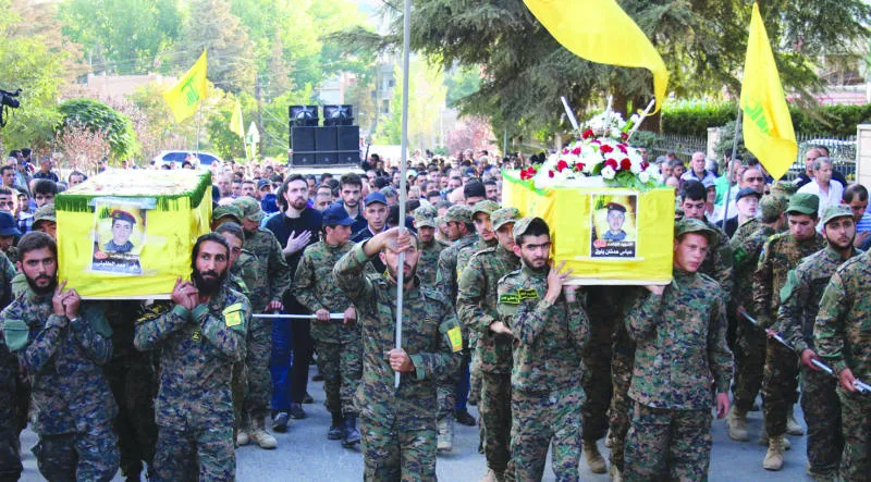 مقاتلون تابعون لحزب الله في بعلبك شرق لبنان يحملون جثامين رفاق لهم قتلوا في معارك بسوريا (أ.ف.ب)