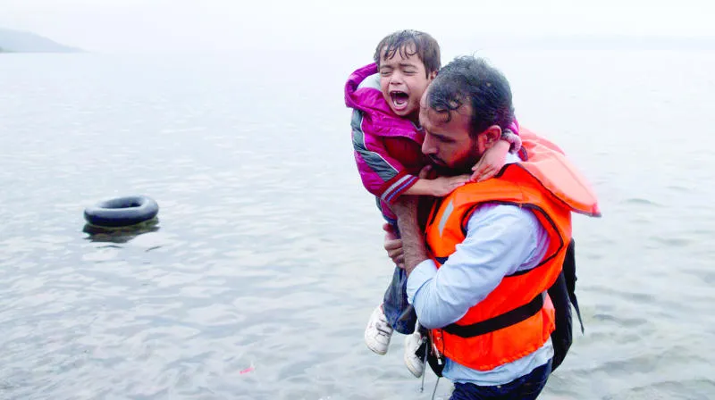 مهاجر يحمل طفلاً يبكي بعد وصولهما برفقة مجموعة مهاجرين آخرين إلى جزيرة ليزبوس اليونانية أمس (أ.ب)