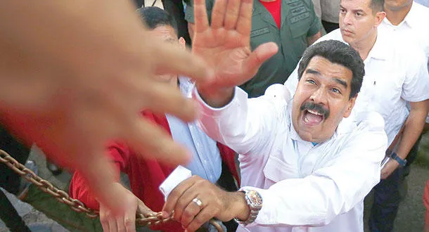 مادورو يحيي أنصاره لدى وصوله للمشاركة في تجمع بالعاصمة كراكاس مساء أول من أمس (رويترز)