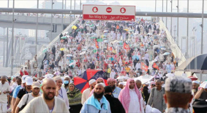 عشرات الآلاف من الحجاج على أحد جسور الجمرات بعد انتهائهم من الرمي أمس (تصوير: عدنان مهدلي)